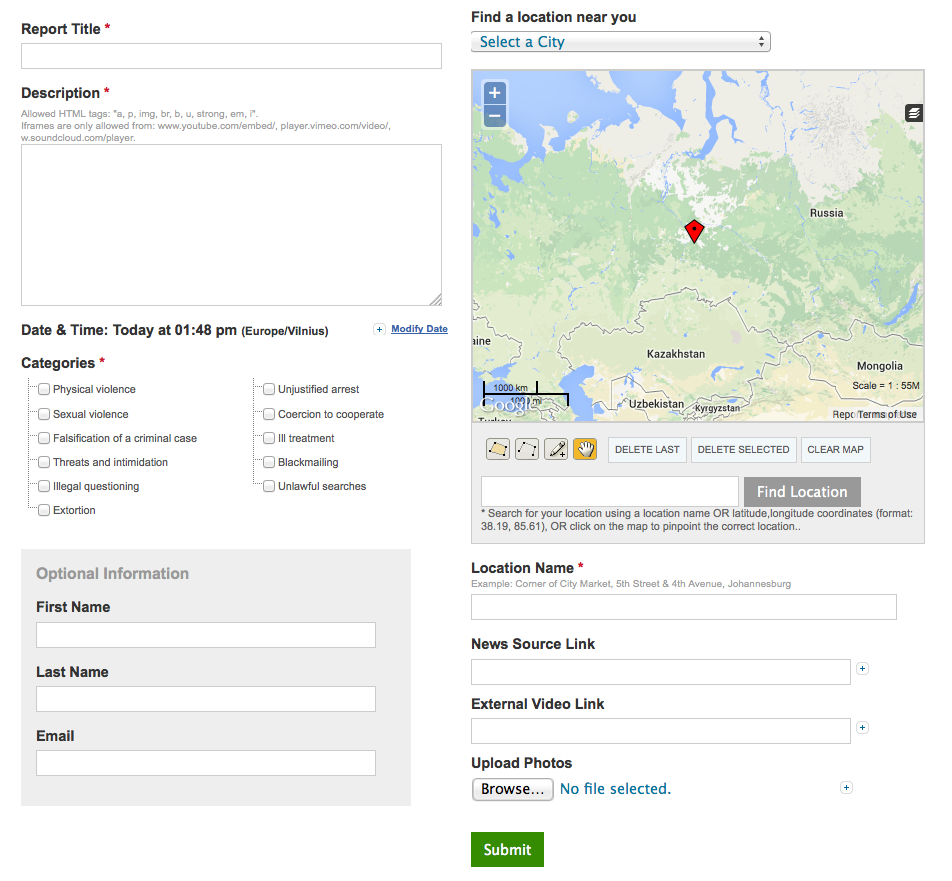 - Hit submit. Please note that your report will not appear on the map until it has been approved by one of the site administrators. After your report is approved it will appear in the list according to the date of the incident (most recent incidents appear first).